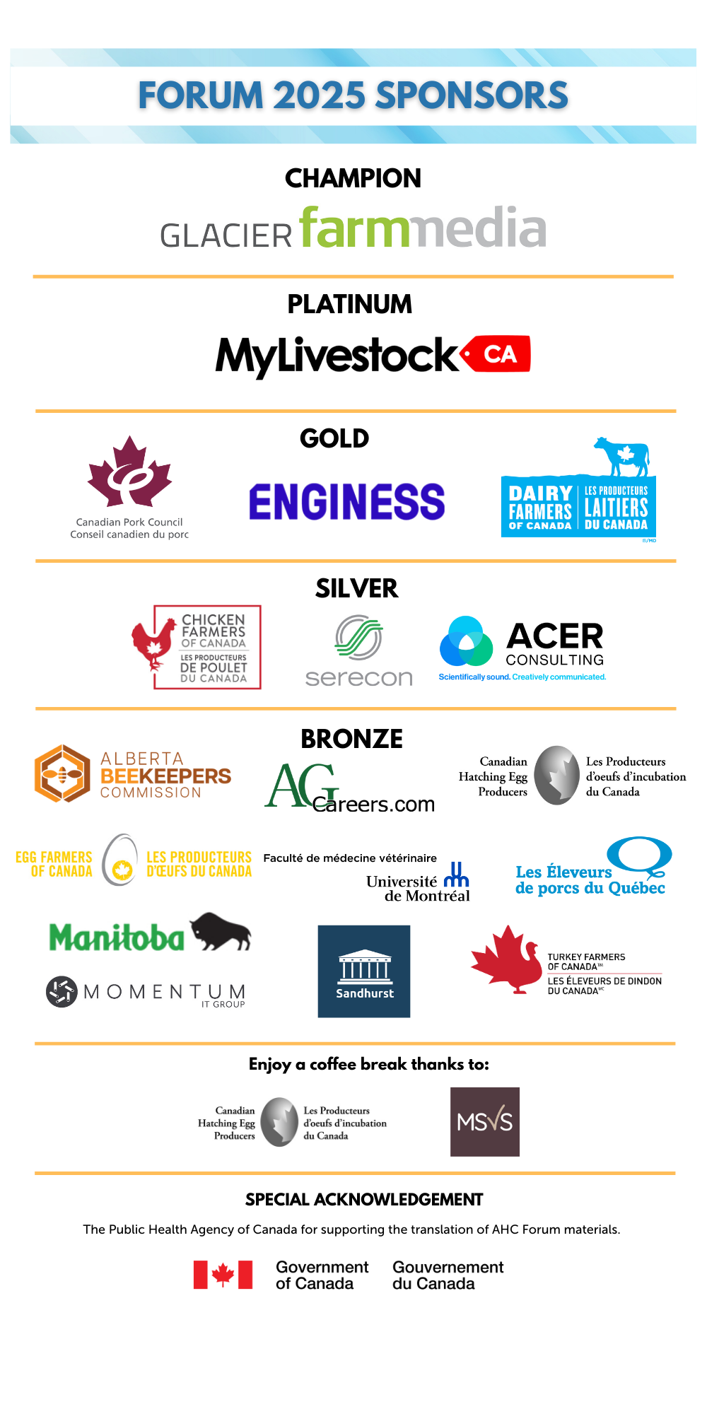 The annual Animal Health Canada Forum is a vibrant meeting place for stakeholders in Canada’s animal health and welfare system. It provides an opportunity for them to collaborate in the work of animal health and welfare in Canada. Participants engage to learn more about AHC’s activities and priorities, hear from thought leaders on topical issues and to share actions and initiatives in relation to animal health and welfare. Our Forum is taking place at the Infinity Convention Centre in Ottawa, Ontario on September 23 & 24, 2025, with a virtual option for attendance also being offered. Simultaneous interpretation will be available.