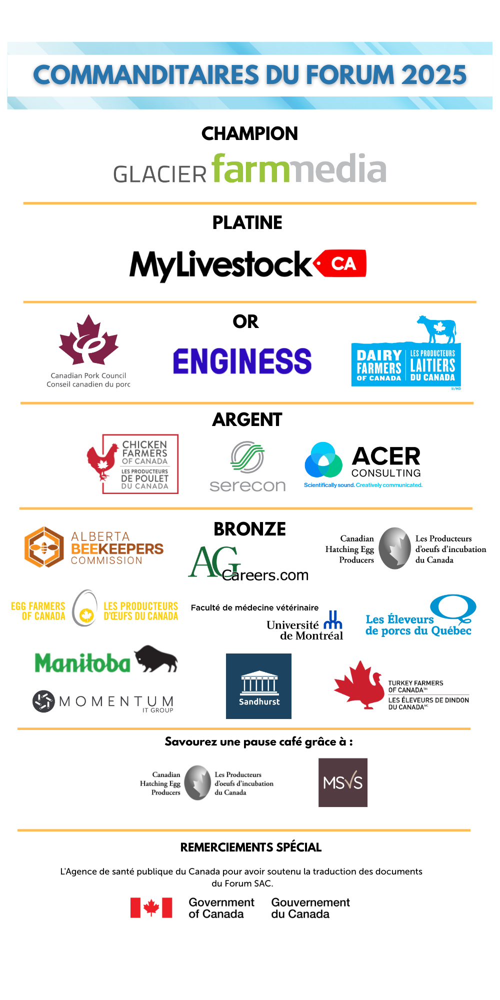 Le Forum annuel de Santé animale Canada est un lieu de rencontre dynamique pour les parties prenantes du système canadien de la santé et du bien-être des animaux. Il leur offre la possibilité de collaborer au travail dans ce domaine au Canada. Les gens assistent au Forum pour mieux connaître les activités et les priorités de SAC, pour entendre des leaders d’opinion parler de sujets d’actualité et pour partager leurs actions et leurs initiatives en lien avec la santé et le bien-être des animaux. Notre Forum aura lieu au Centre des congrès Infinity les 23 et 24 septembre 2025; il sera également possible d’y assister virtuellement. Un service d’interprétation simultanée sera disponible.