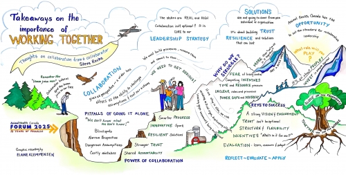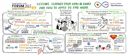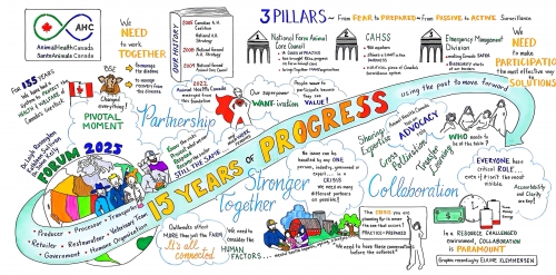 During a panel session on day one, AHC industry co-chair Dr. Leigh Rosengren of the Canadian Cattle Association provided a history of Animal Health Canada - what shaped the organization and its successes in addressing the animal welfare and health challenges facing Canada’s food animal production system. Her presentation was captured graphically by Elaine Klemmensen of Evolve Leadership Coaching and Consulting. (Click on graphic below to enlarge)